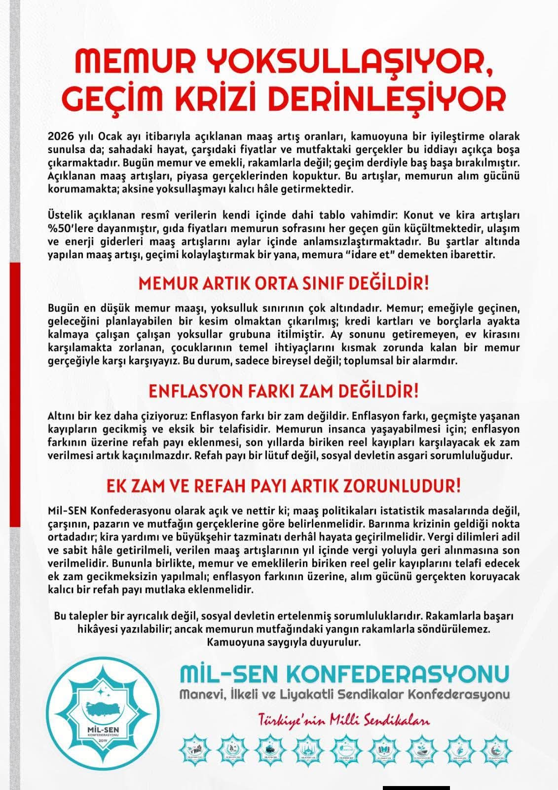 Mil-SEN Konfederasyonu olarak açık ve nettir ki; maaş politikaları istatistik masalarında değil, çarşının, pazarın ve mutfağın gerçeklerine göre belirlenmelidir. Barınma krizinin geldiği nokta ortadadır; kira yardımı ve büyükşehir tazminatı derhâl hayata geçirilmelidir. Vergi dilimleri adil ve sabit hâle getirilmeli, verilen maaş artışlarının yıl içinde vergi yoluyla geri alınmasına son verilmelidir. Bununla birlikte, memur ve emeklilerin biriken reel gelir kayıplarını telafi edecek ek zam gecikmeksizin yapılmalı; enflasyon farkının üzerine, alım gücünü gerçekten koruyacak kalıcı bir refah payı mutlaka eklenmelidir.